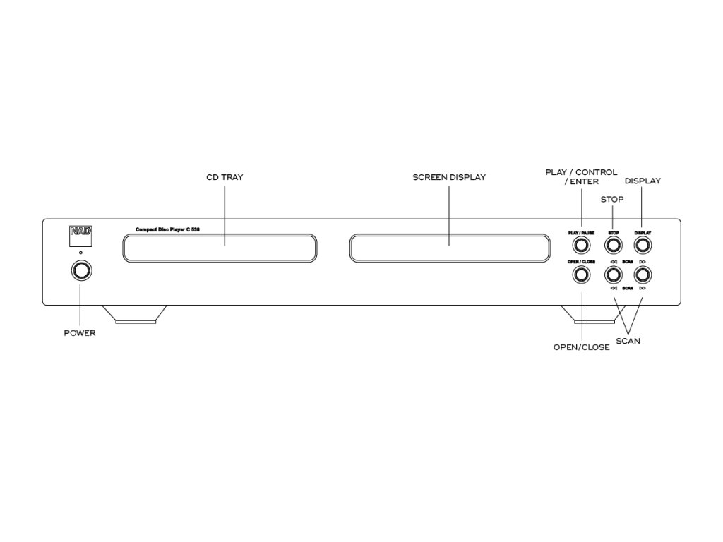 - Ovladače předního panelu jsou taky na ručním dálkovém ovládání, které umožňuje funkce přehrávání, pozastavení, přeskočení a skenování a mnoho dalších funkcí