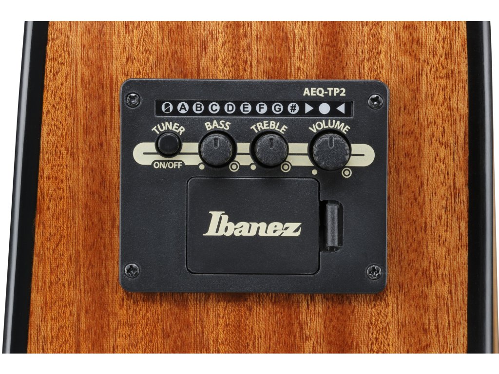 Masivní deska ze smrku Sitka nabízí mimořádně široké frekvenční spektrum se třpytivými výškami, přesnými středy a plnými basy, doplněné o zadní desku a boky ze sapelu, které poskytují teplý, plný zvuk a jasné nuance. Snímač Ibanez T-Bar Undersaddle spolehlivě přenáší tento přirozený zvuk do jakéhokoli zesilovacího systému, podporovaný předzesilovačem AEQ-TP2.