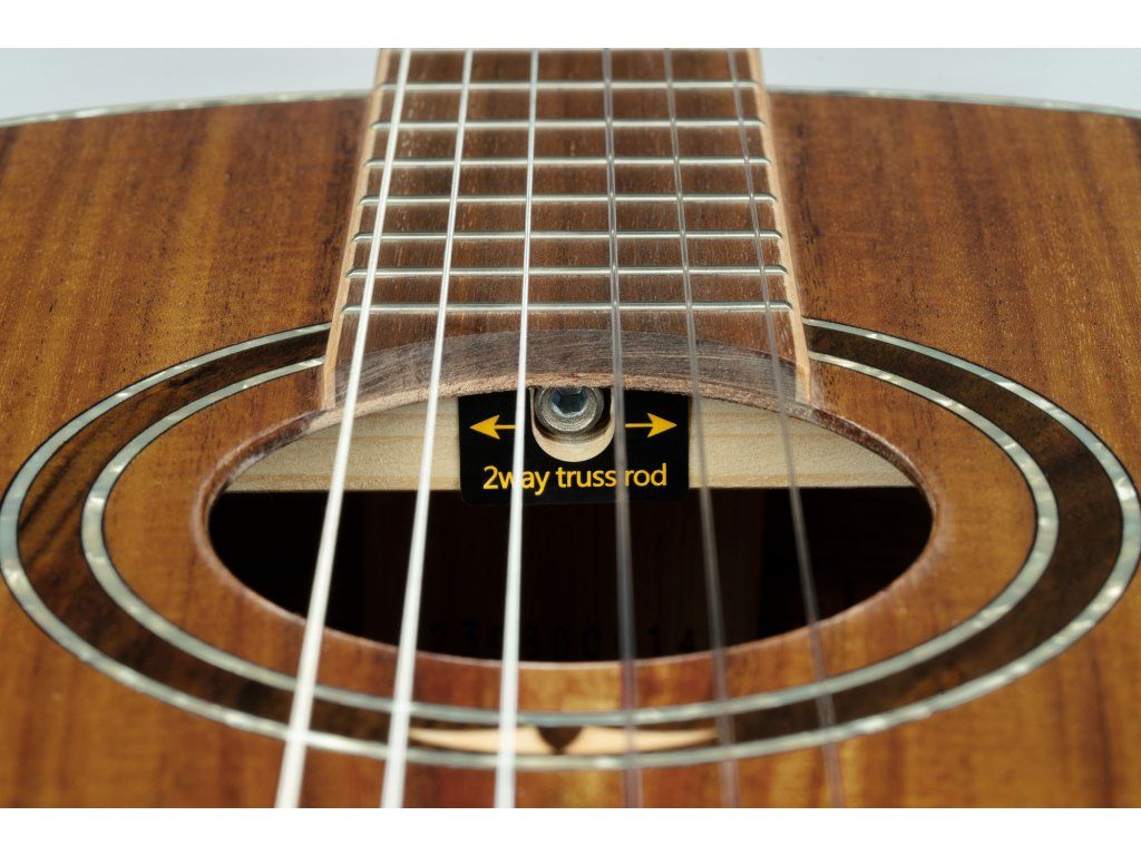 Hezké zpracování podtrhuje javorová lemovka těla a hmatníku doplněná výložkou z imitace perleti, vykládaná rozeta a perleťové poziční tečky na dvanáctém pražci.