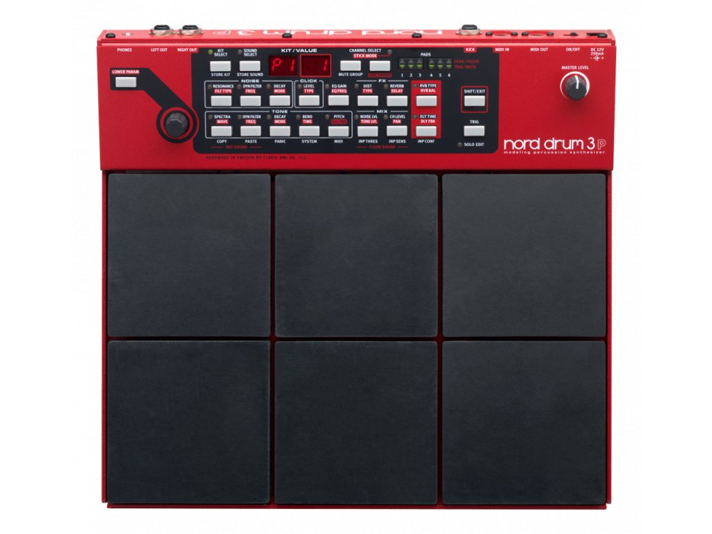 Nord Drum 3P je bicí syntezátor nabitý řadou zvuků a pokračovatel úspěšného modelu Nord Drum 2. Oproti svému předchůdci disponuje několika novinkami. Tou hlavní je šest padů, které jsou ve verzi 3P zabudovány přímo v syntezátoru. Proměnou prošlo i uživatelské rozhraní, které je nyní mnohem přehlednější a umožňuje rychlejší výběr zvuku. Zvuky jednotlivých bicích jsou navíc řazeny v příslušných knihovnách (kopáky, virbly ad.). Nově lze také každému ze šesti zvuků přiřadit Reverb nebo Delay a nastavit jejich úroveň. Každý z 6 kanálů je vybaven třemi sekcemi pro zvukovou syntézu a mixérem pro jejich vyvážení. Sekce „Tone“ vytváří tělo zvuku a dokáže pracovat s běžnými i velmi komplexními zvukovými vlnami. Možné je pracovat s low-pass filtrem a parametry jako sweep pro dynamickou funkci LPF, punch pro zesílení attacku, decay upravující délku doznívání, pitch odstupňovaným po čtvrttónech a samozřejmě bend pro dynamickou úpravu výšky tónu. Sekce „Noise“ slouží k obohacení zvuku o texturu různých barev. Poslední sekce „Click“ pracuje zejména s attackem a nabízí 27 různých nastavení. Nord Drum 3P samozřejmě umožňuje pracovat i s efekty – nejprve jde o Distortion / Crush efekty, které reagují na signál z Tone a Noise sekcí, kompletní zvuk lze pak dále modelovat pomocí EQ a Repeat efektu, který funguje v podstatě jako MIDI delay. Samozřejmostí je rozhraní MIDI pomocí nějž lze Nord Drum 3 připojit k počítači nebo tabletu a pohodlně nastavovat jednotlivé parametry nebo vytvářet sekvence. Nord Drum3 funguje skvěle také jako kontrolér vaší oblíbené hudební aplikace. Ať už jsou elektronické bicí vaší doménou nebo si jen chcete rozšířit zvuk, doporučujeme Nord Drum 3P určitě vyzkoušet. Technické údaje: • Bicí syntezátor • Výkonný zvukový modul s resonantní, substraktivní a FM syntézou • Individuální knihovny pro jednotlivé bicí • Reverb a Delay pro každý kanál zvlášť s nastavením úrovně • 6 kanálů se 3 sekcemi + mix + efekty • Výstupy: sluchátkový, L/R out 1‘‘ jack • MIDI I/O • Vstup pro připojení basového bubnu • LED display • Napájení: adaptér (součástí) • Rozměry: 222 x 43 x 140 mm • Váha: 695 g • Balení obsahuje : 1x Nord drum 3, 1x držák Nord drum 3, 1x adaptérDoplňkové parametry