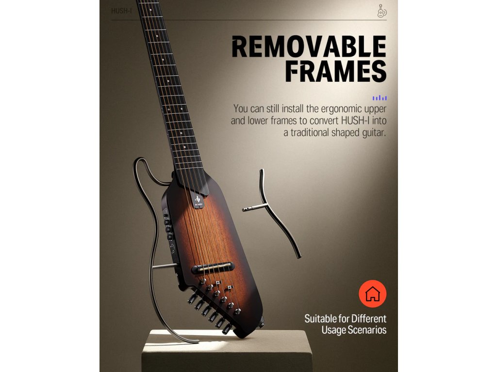 Donner HUSH-I porušuje konvence s bezhlavým stručným designem rámu, který poskytuje dokonalé zhutnění pro cestování a různé herní scénáře. Celkový design a výběr materiálu hmatníku a rámu také šetří extra použití dřeva, díky čemuž je Donner HUSH-I jednou z nejekologičtějších dřevěných kytar.