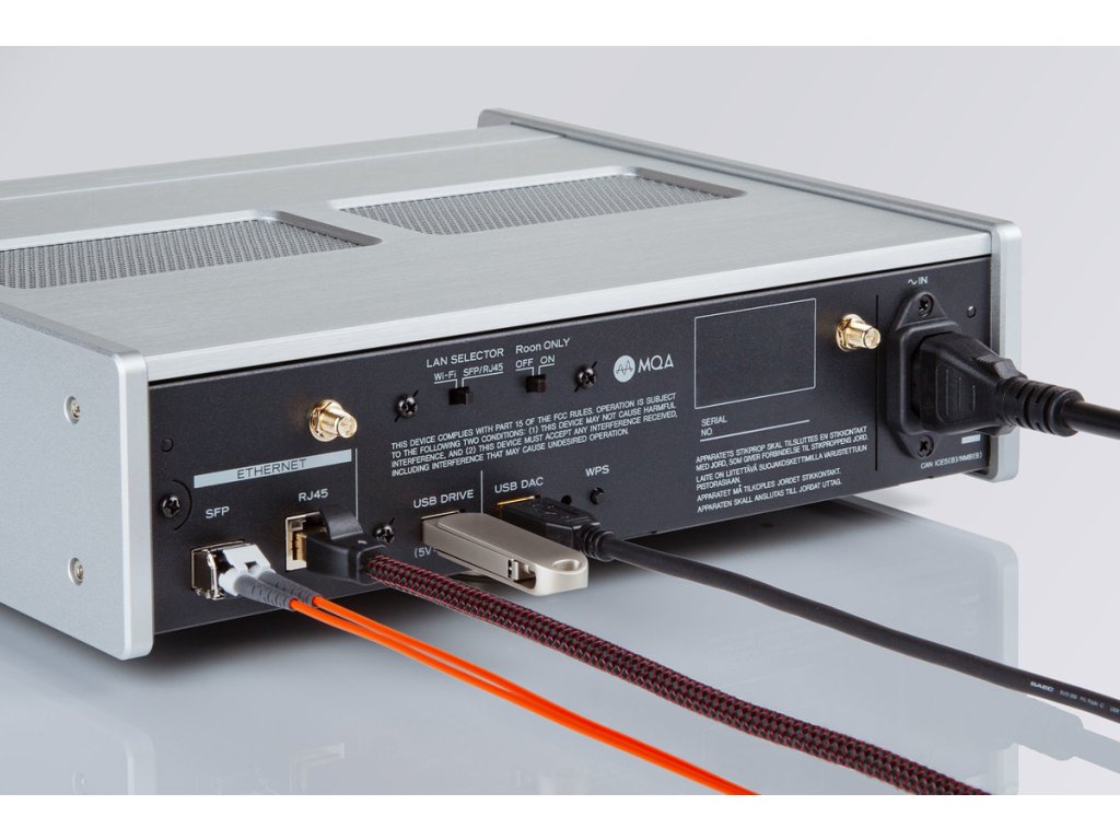 Integrovaný síťový switch spravuje obě kabelová rozhraní (SFP + RJ45). Připojení přes optické vlákno představuje technický argument pro audiofily, kteří hledají maximální izolaci od síťového šumu. Streamingové služby a režim Roon
